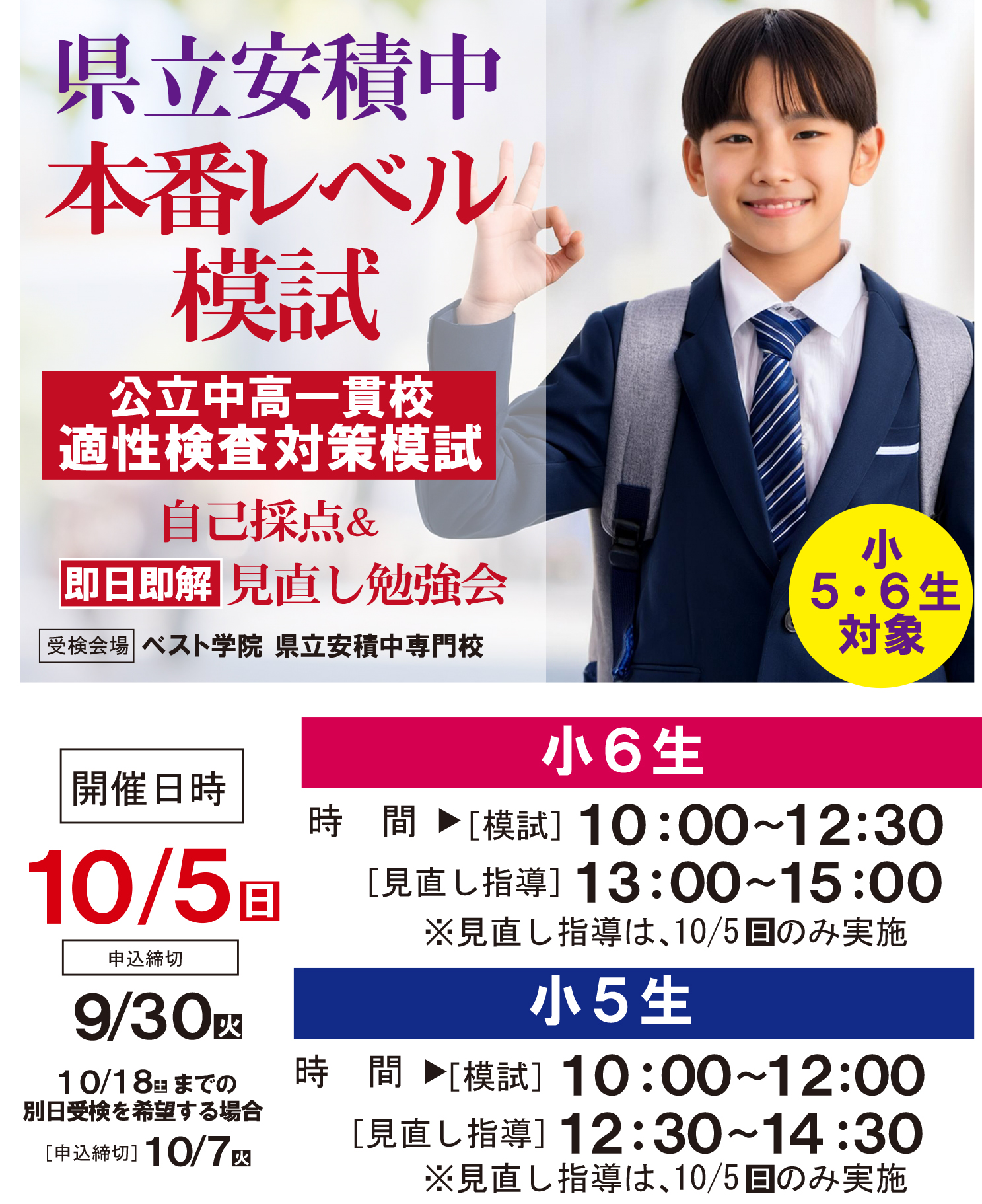 ★県立安積中合格を目指す小5・6生の皆さんへ★10/5(日) 適性検査対策模試を実施します!