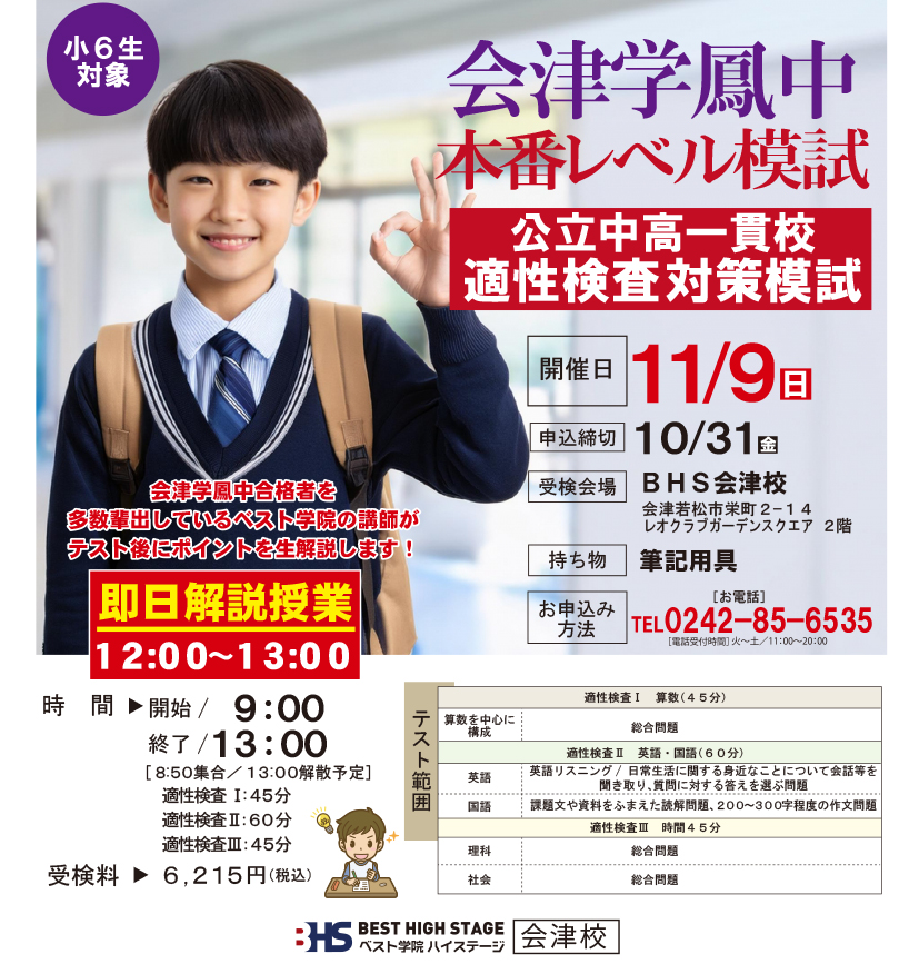 ★★★即日解説授業あり★★★会津学鳳中合格を目指す小6生の皆さん~11/9(日) 適性検査対策模試を実施します!~