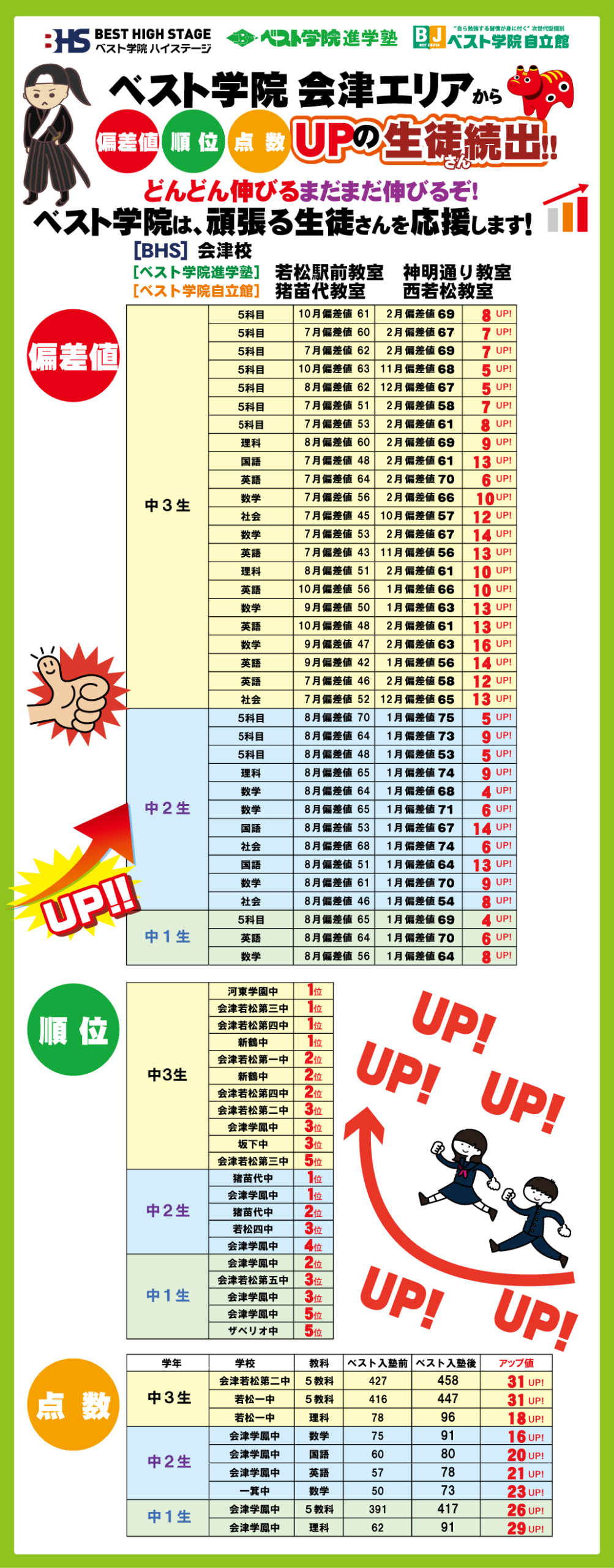 会津エリアのベスト生 新教研模擬テスト・各中学校の定期テストで、多くの生徒が偏差値・校内順位・得点の各項目で大きな成績向上を達成しています!