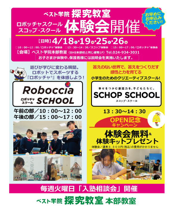 ベスト学院 探究教室では、「ロボッチャスクール」「スコップ・スクール」の体験会を開催します。