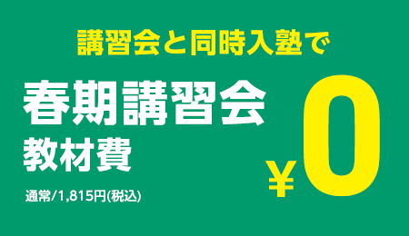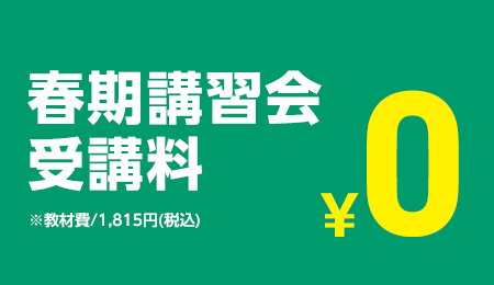 | 新中2・3生 | 45分×2コマ×4日間 ■教科:5教科(国・数・英・理・社) ■受講料:¥0 ※別途教材費:¥1,815(税込)⇒同時に入塾で¥0 |